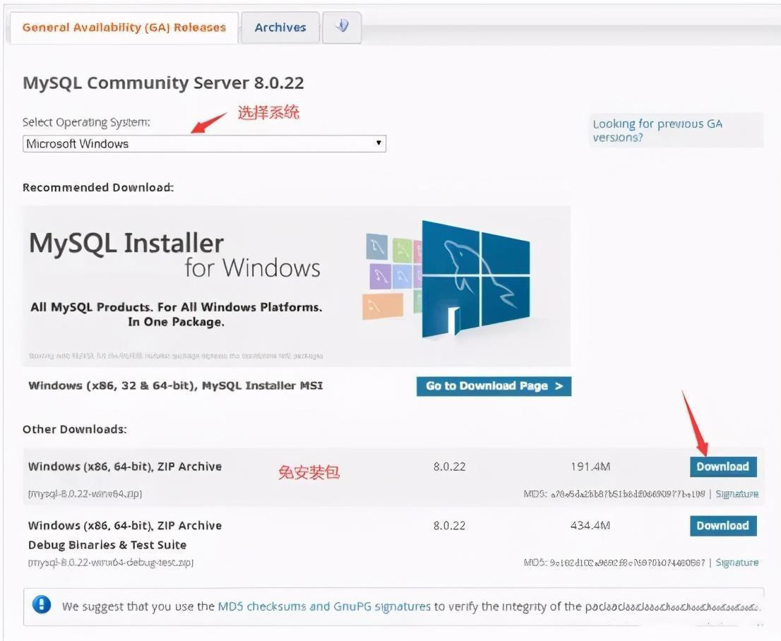 进入MySql官网[https://dev.mysql.com/downloads/mysql/],选择操作系统,默认是windows,下面选择免安装压缩包下载