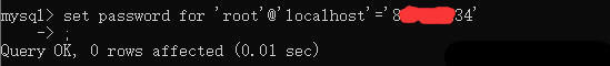 登录之后命令行的提示已经变成了mysql> 输入set password for 'root'@'localhost'='你的新密码';回车即可修改,不要忘记后面的分号哦