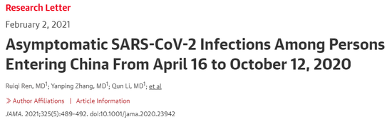 来源:医学新视点 新冠病毒无症状感染的普遍程度,自疫情发生以来都是全球关注的重要问题之一,也多次有研究提出将无症状感染视为防控关键因素之一。 《美国医学会杂志》最新发表一篇中国疾控中心流行病学首席专家吴尊友教授团队的研究成果,通过分析入境中国的近2000万旅客和其中输入性病例的情况,发现国际旅客中无症状感染比例增加。截图来源:JAMA 这项回顾性队列研究纳入了2020年4月16日-10月12