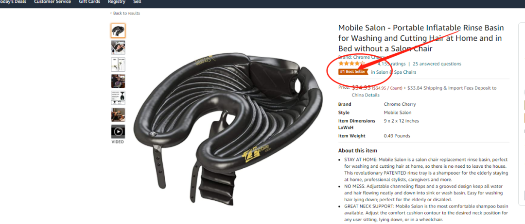 目前Chrome Cherry 充气洗发盆在亚马逊的沙龙洗发产品类目中销售排行第一,有销售相同以及近似产品的卖家们要注意自查下架。