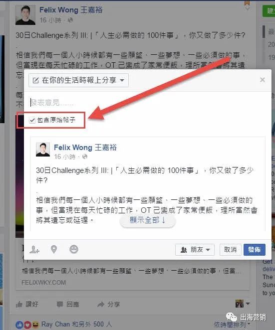 看到吗?这位朋友在分享时,没有包含到我贴文上的文字!因为在分享贴文时,Facebook提供选项,可让用户减去文字。