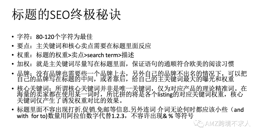 •权重:标题的权重>卖点>searchterm>描述•加权:就是主关键词尽量写在标题里面,保证语句的通顺符合欧美的阅读习惯关于标题的设置的几个疑问?•因为设定了一个核心关键词,在标题.5点.描述,都加重了核心关键词的权重。但是核心关键词为何搜不到自己的产品。以及按店铺名搜自己产品,在产品下面,亚马逊推荐的相关联产品跟自己的产品百分之九十不挂钩。请问这怎么破?•答案:1.关键词权重