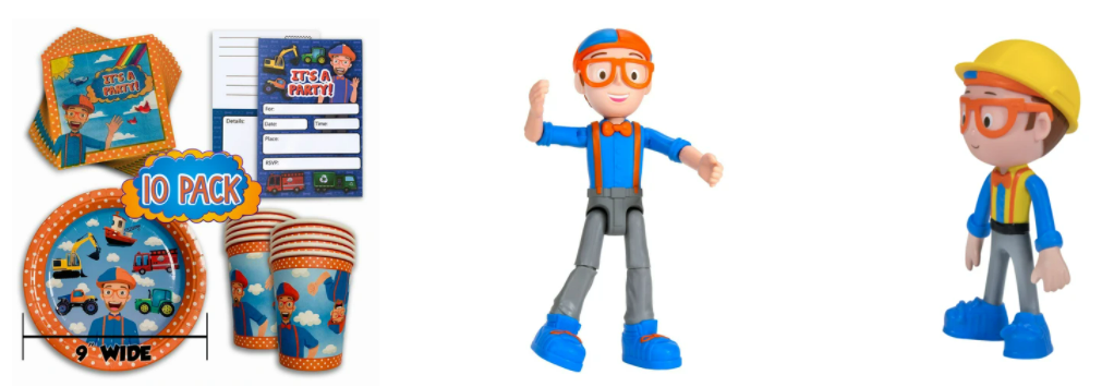 品牌销售产品包含Blippi形象相关的各种服饰衣帽,玩偶,餐具,生日装饰等。