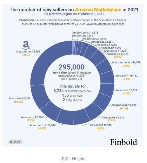 根据Finbold发布的数据显示,截至3月份,亚马逊今年在全球范围内迎来了295000名新卖家,相当于每天有3734名、每小时有155名、每分钟有2名新卖家入驻亚马逊。预计到今年年底,将会有140万新卖家加入亚马逊平台,约1/4(26%)以上的新卖家将通过美国市场入驻。