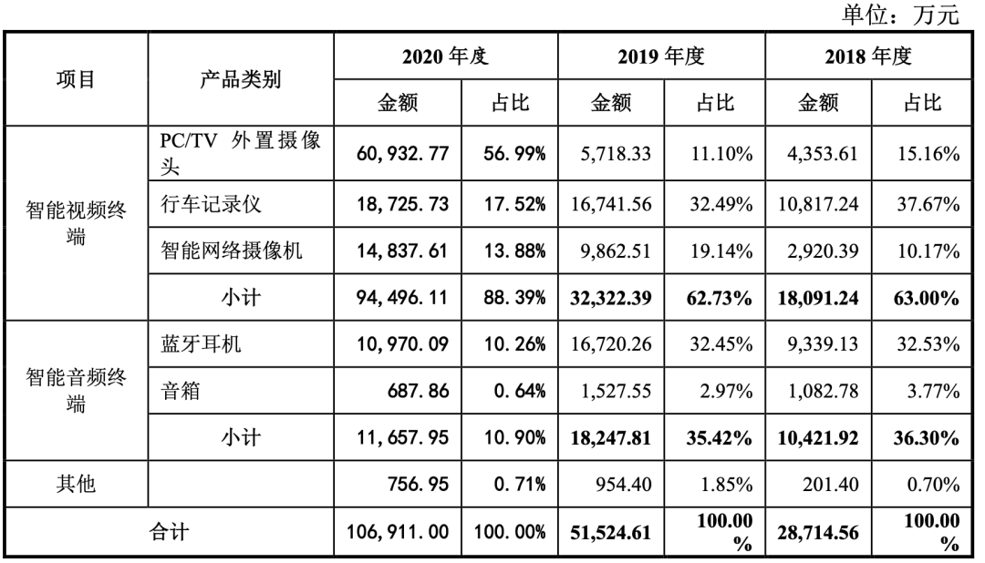 看看历史数据,2018-2020年, 奥尼电子PC/TV 外置摄像头销售收入分别为4353.61万元、5718.33万元和60932.77万元,2020年收入对比2019年增长了10倍还多!