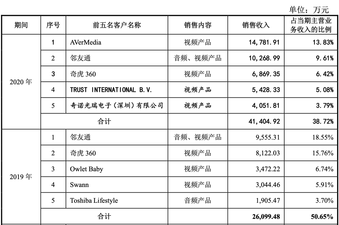 其ANC等自有品牌业务中,销售的产品主要为 PC/TV外置摄像头和耳机,两者销售合计占比分别为 97.37%、97.03%和 99.59%,销售占比非常集中。