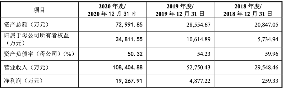 2018-2020年,奥尼电子的营业收入分别为29548.46万元、52750.43万元和 108404.88万元,净利润分别为259.33万元、4877.22万元和 19267.91万元。2020年可谓丰收之年,营收翻倍,净利润直接是4倍!