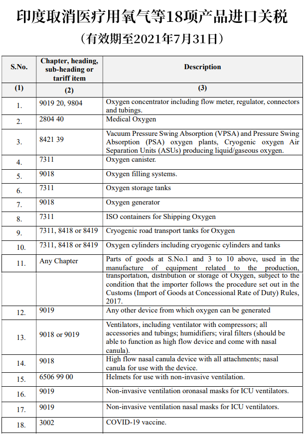 印度财政部于4月24日发布第28/2021-Customs公告,取消医疗用氧气(Medical Oxygen,HS 280440) 、储存瓶、造氧机(Oxygen Generator,HS 9018) 、呼吸器(Ventilator,HS 9018/9019) 、氧气面罩等18项产品进口关税,至2021年7月31日止。