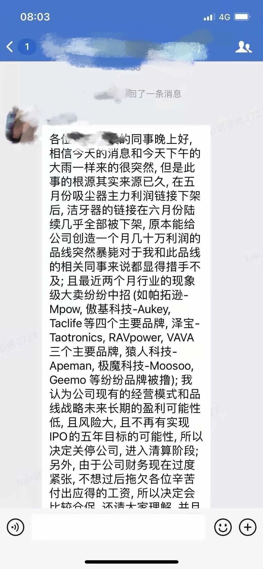 今日凌晨,厦门某知名跨境电商企业老板在公司群内向员工们发出了一则破产通告。内容表示:封号的消息就如这座城市的大雨一样突然。5月吸尘器主力链接下架,6月洁牙器全部链接下架,原本能给公司一个月创造十几万利润的突然暴毙,实在让人措手不及。公司现有的经营模式和产品线已经担负不起未来的盈利要求,也抗不起亚马逊的经营风险,更不再具备实现5年内IPO的可能性...所以决定关停公司,于7月1日开始进入清算阶段。知