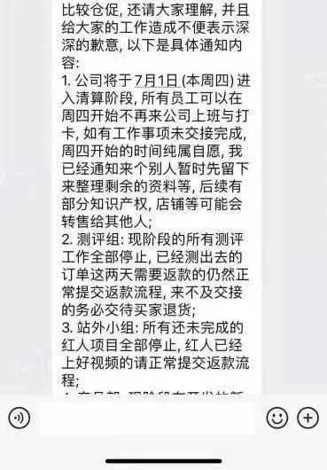 所以决定关停公司,于7月1日开始进入清算阶段。知识产权、店铺将转售他人;所有测评项目立即停止,已经送测的正常返款,来不及交接的需提醒买家退货;站外未完成的全部停止,已完成的正常返款...