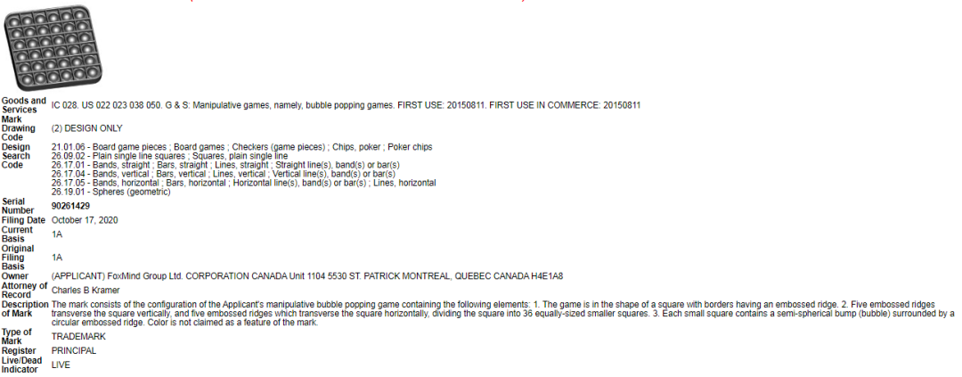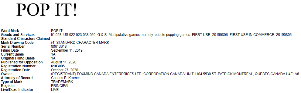 文字商标POP IT不可出现在listing上,否则极有可能触发侵权危机,不少被起诉的卖家都是因为使用了这一商标。