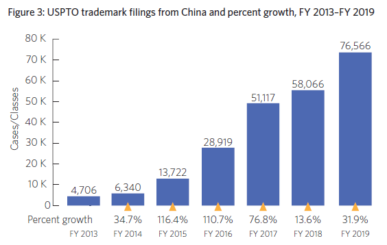 2021年1月初,USPTO发布了一篇《中国专利和商标:非市场因素对知识产权系统注册趋势的影响》,提到在USPTO于2019年向议会提到的中国影响时引用的商标数据是"从2014年的5161件上涨到2018年的54064件"。