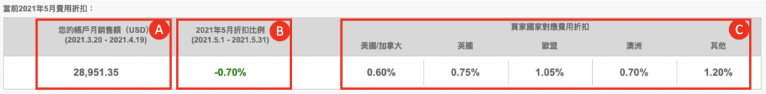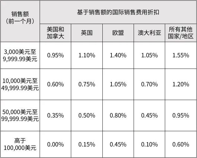 从上表中可以看出,销售额越高,可以享受的折扣越大。如果卖家的帐户每个月总销售额达到十万美元,销往美国和加拿大部分的国际销售费用就低至为零了。