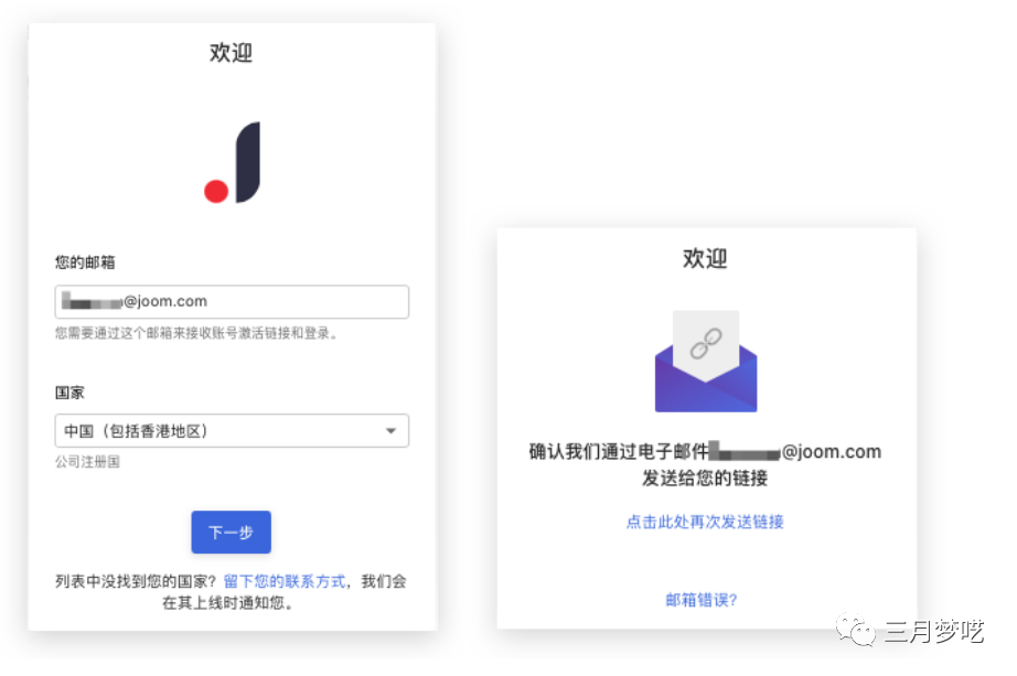 2. 添加完微信,获得专属入驻链接,填写经理安排的入驻链接,接收入驻链接,选择国家,点击下一步