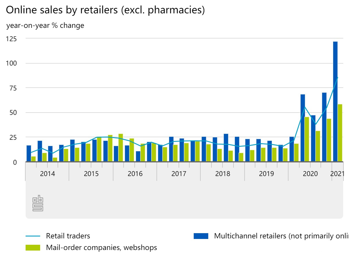此外,相对于2020年第一季度,荷兰新成立的网店数量增加了30%以上。与2019年初相比,这一数字甚至增加了一倍多。