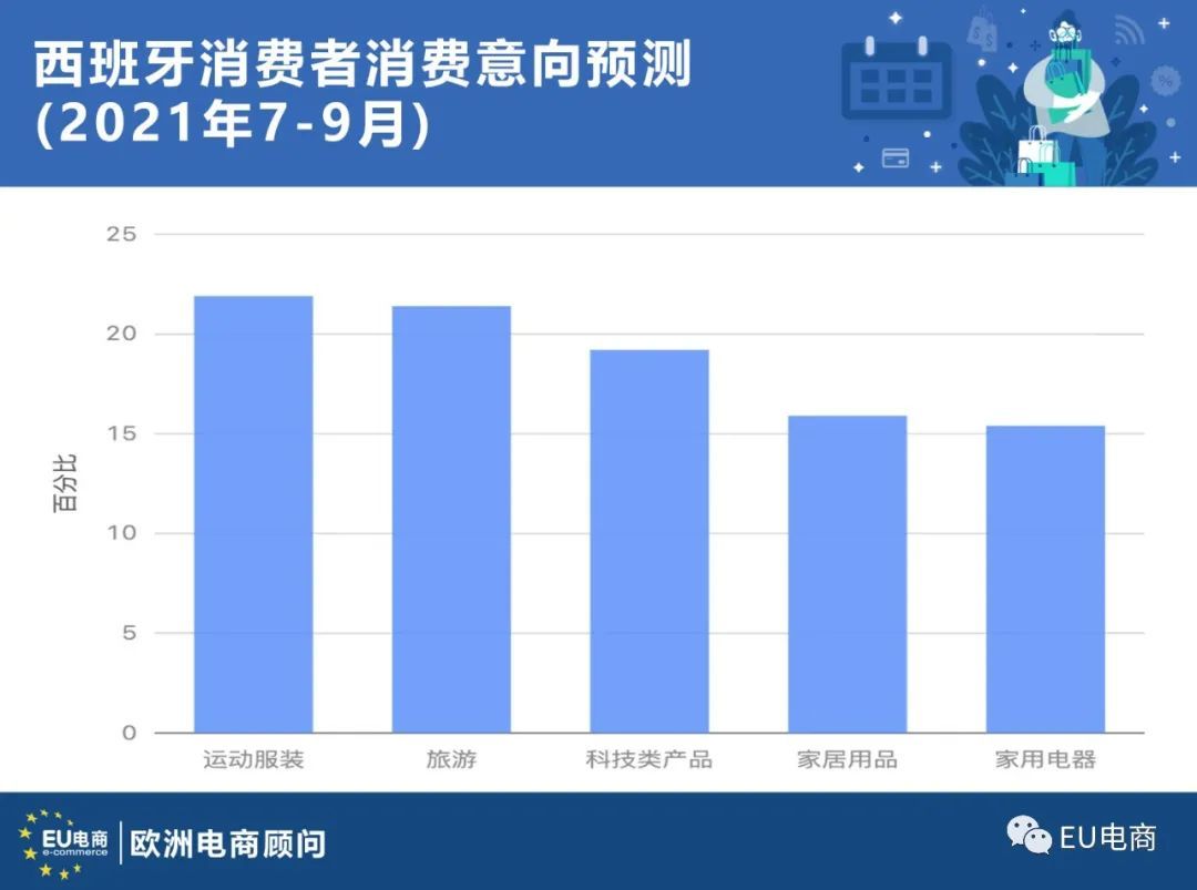 据最新数据显示,2021年夏天7月至9月下半月西班牙消费者消费意向排名前五位的为,运动服装(21.9%),旅游(21.4%),科技类产品(19.2%),家居用品(15.9%),基本家用电器(15.4%)。该数据与2020年的数据相比,西班牙消费者对智能手机的消费意向大大减少,运动服装或将成为今夏最热销品类。