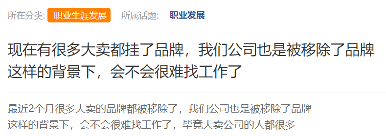 另一位卖家因为前东家被封号潮波及了,担心被裁员,于是在论坛发帖求助:"现在很多大卖都被挂了,我们公司也被移除了品牌,会不会很难找工作了?毕竟大卖公司人都很多。"