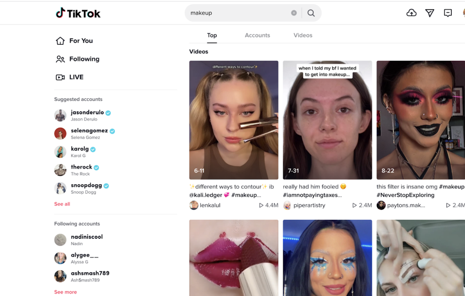 1. 在 TikTok 上寻找红人最直接的方式就是关键词搜索,比如美妆类可以搜索 makeup、beauty 等关键词,也可以搜索竞品相关的关键词。之后可在 Top、Videos、Hashtags 找到对应的视频,分析判断红人是否符合自己的需求。
