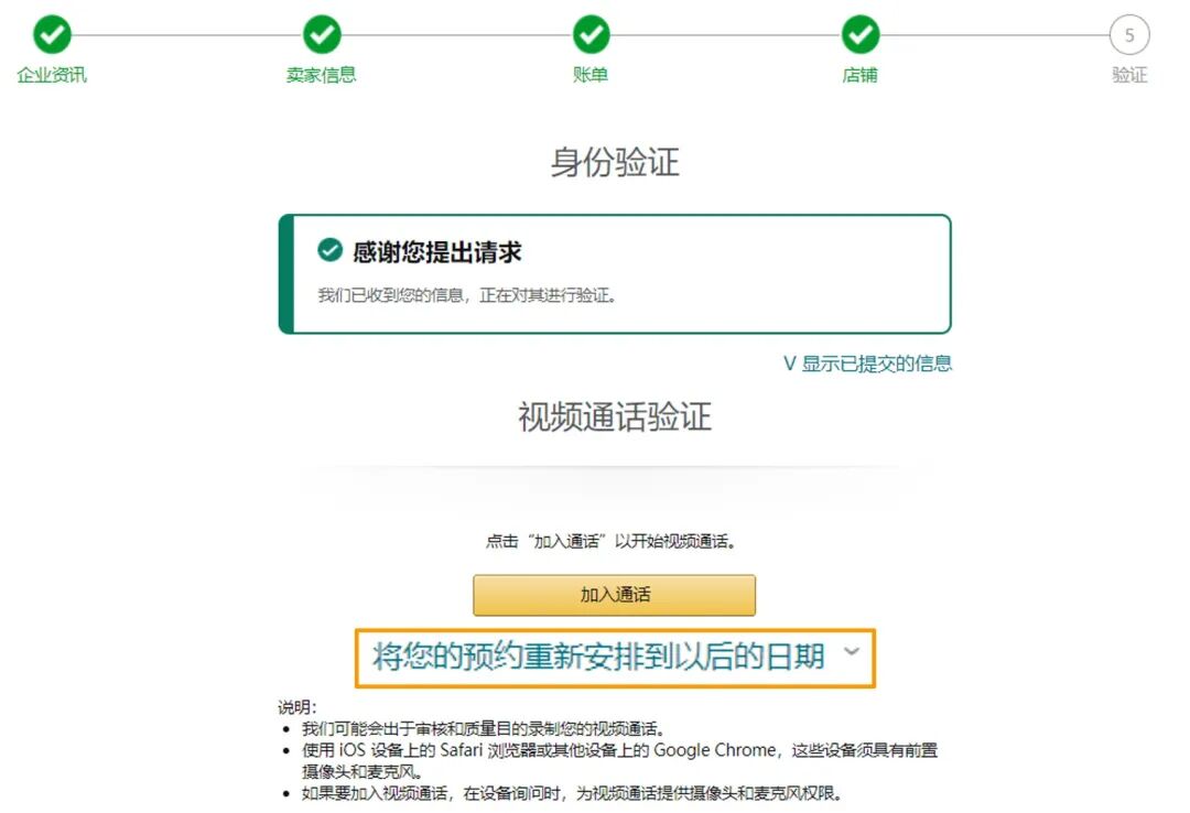 若在此步骤,您因为自身原因无法再进行后续视频通话,您可以点击"将您的预约重新安排到以后的日期"切换到第二种视频验证方式,根据您的实际情况,预约一个以后的时间进行视频验证。