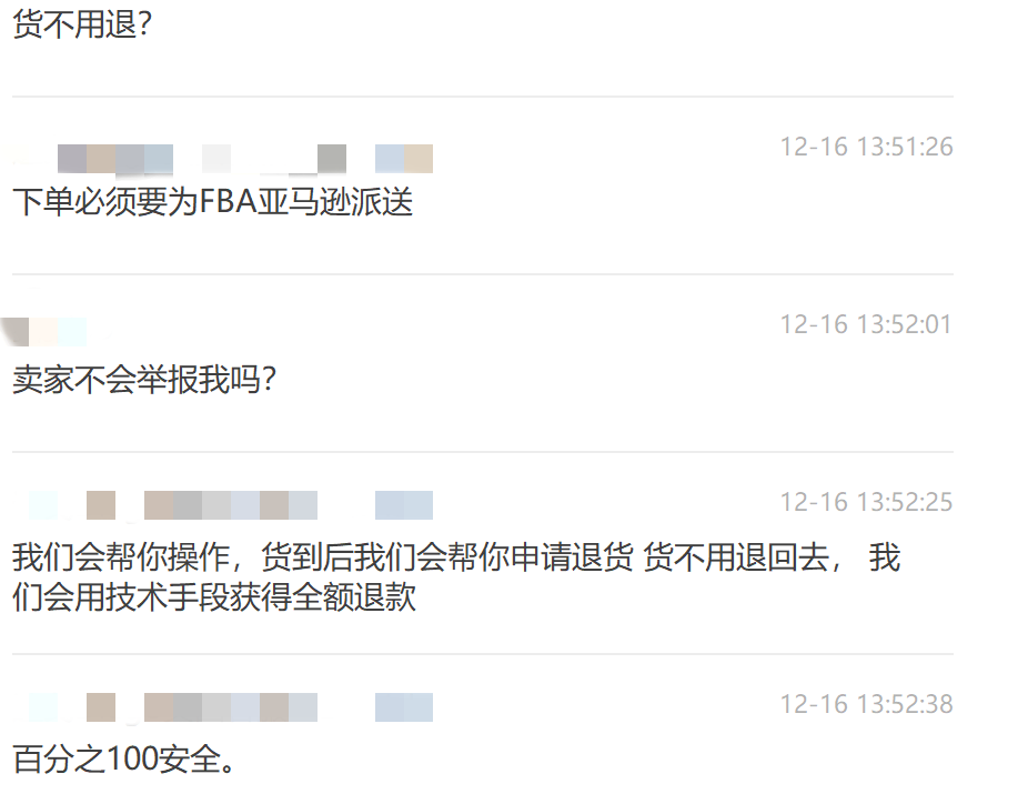 有卖家打入其内部探底,据对方透露,在亚马逊上购买的产品必须为亚马逊自营或FBA卖家的产品。下单之后该机构将会代替买家申请退货,利用技术手段帮助买家在保留货物的基础上获得全额退款,然后向其支付货品价值的40%佣金。