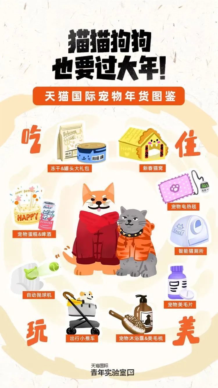 这届年轻人的确流行起给宠物们"办年货"。今年,宠物新年服首次入选了天猫十大增速最快的"新"年货。过去一个月,宠物"衣食住行"相关的进口商品在天猫国际迎来销售高峰,其中宠物新年礼包搜索量已经翻倍,宠物主食罐头、清洁用品等销售额同比增长超60%。
