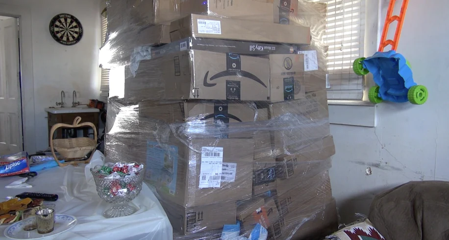 在昨天当地警方召开发布会,称在600多件散落的货物中找到了一个信封,根据信封上的名称和地址,警方锁定并突入了一个民宅中,结果让人大吃一惊,整个房子塞满了未拆封成堆成堆的亚马逊货件。