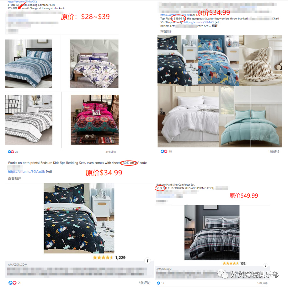 【3】Facebook寡头低价推广较多。从帖子热度看,折扣比均在50%OFF,折后价格集中在17.49美金。普通卖家用折后20美金-30美金的价格来推是推不过寡头的。这也是为啥同样是50%OFF,你和他,差距却这么大的主要原因所在。