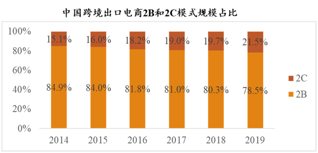 2019年中国跨境电商交易规模达10.5万亿元,其中出口占比76.5%,即2019年中国跨境出口电商市场规模约8万亿,增速13.1%;出口电商按模式看,2019年 2C 模式交易规模1.7万亿元,占出口电商总额的21.5%,增速23.6%。与 2B 模式相比,虽然 2C 目前占比较低但在逐渐提高 。