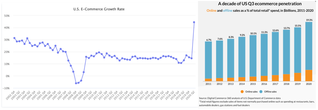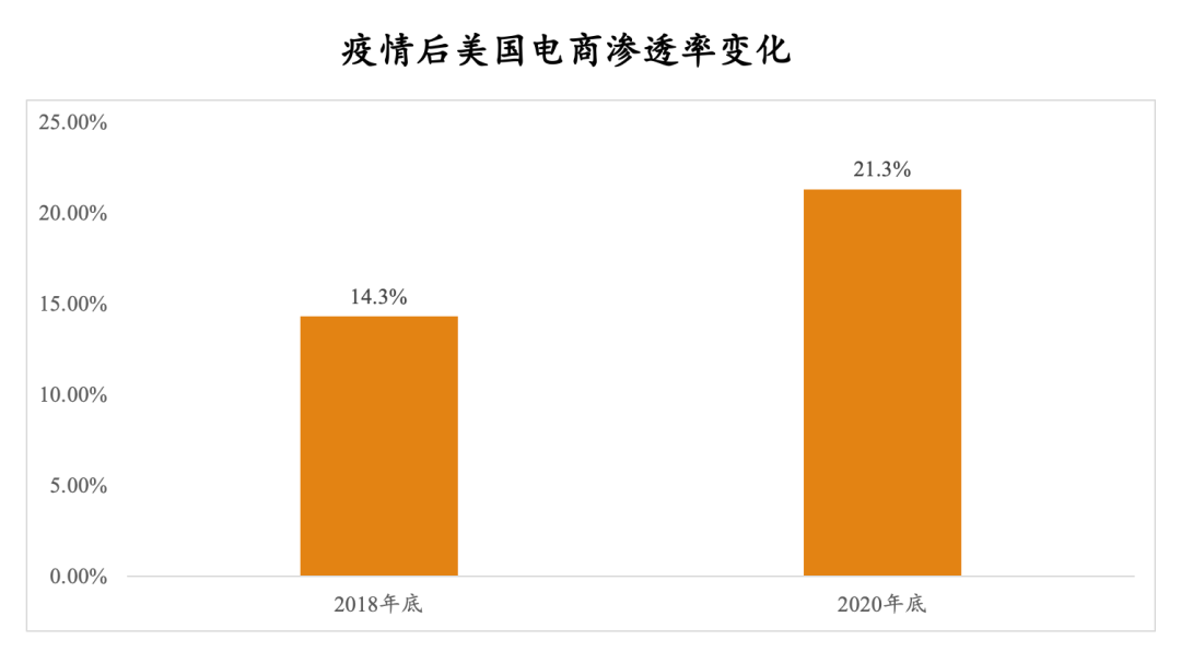 COVID-19 疫情彻底改变了美国电商原有的发展路径,线下零售业态被迅速地线上化,电商渗透率迅速提升:疫情前14.3%(18年底,比较稳定),2020年21.3%(美国20年电商销售额为8611.2亿美元,同比增长44%)。对于线上来说这是一个巨大的增量,需要被 B 端供应链支撑满足,美国本土供应链和卖家体系无法完全承接这种变化,这其中必然离不开中国制造。
