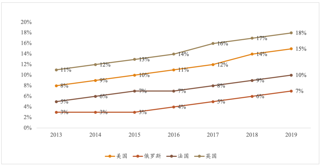 a)从长期来看,欧美发达国家线上渗透率仍很低,有着巨大的上涨空间:我国主要出口国家美、法、俄、英在过去几年的电商渗透率不断攀升,英国渗透率最高,2019年达18%,其次美国15%,法国10%,俄罗斯7%,为我国的电商出口提供了良好的环境。