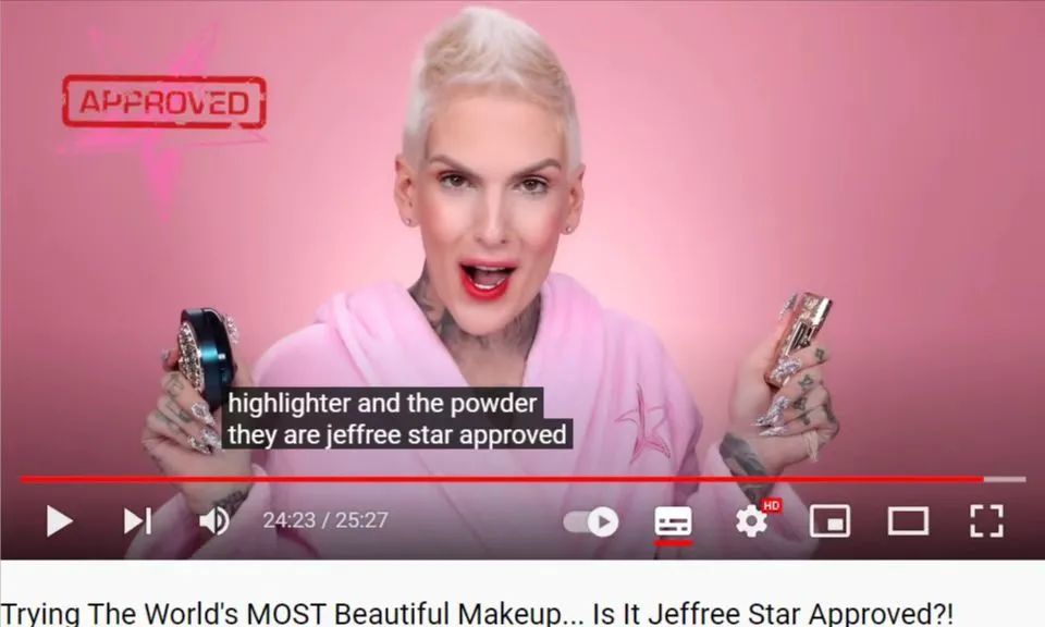 鼎鼎大名的Jeffree Star 坐拥Youtube1000多万粉丝,业务能力出色,能在15秒内,用眼影刷在做过脱毛的脸上画出好看的眉毛。除了美妆博主外,他创立了自己的美妆品牌,且被评为美国十大彩妆品牌之一。