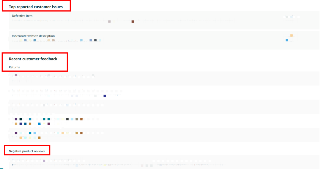 在查看详情页面,我们可以查看到该商品的退货率,最常报告的买家问题,近期买家反馈以及商品的负面评论。