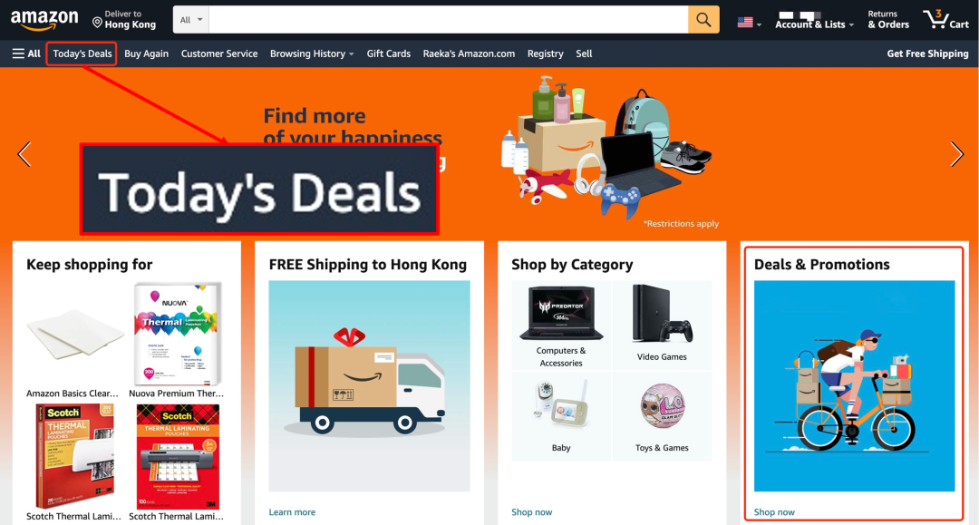 除了顶端菜单栏和首屏广告位,参与促销活动的商品在亚马逊上有专属的Today's Deals页面,为产品带来高流量。