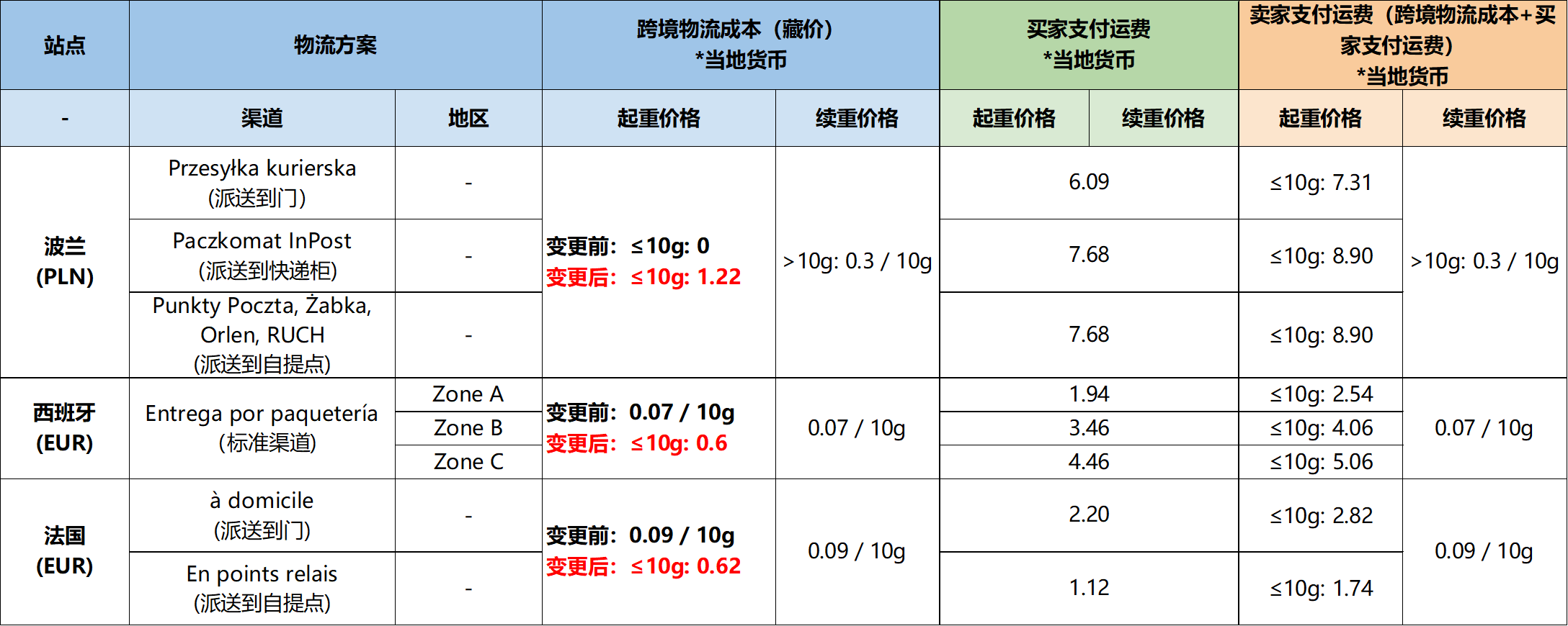 为了更好的提高平台服务质量,Shopee将于2022年2月15日调整欧洲站点的跨境物流成本(即藏价)。其中波兰站点,西班牙站点和法国站点SLS各物流渠道藏价均会变更。
