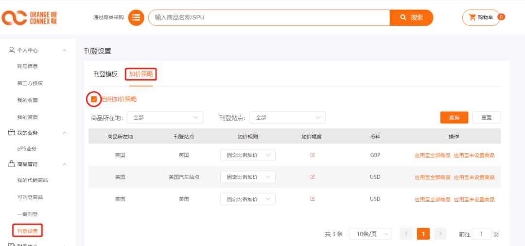 ♦ 登录由橙联提供的橙e供应链平台,进入商品管理→刊登设置→加价策略,点击"启用加价策略",在页面下方可按"固定比例加价"或"固定值加价"。