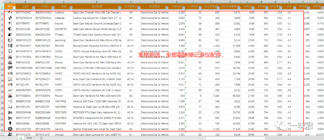 下载前100名链接数据,然后在表格上做刷选并剔除记录仪配件,剩下来就是记录仪产品,比如下图。