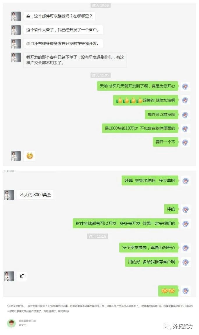 尤其是现在是外贸旺季,是国外采购商更换供应商的黄金时期,这个时候主动去联系客户,能开发到很多平时开发不到的优质客户。顶易最新客户,启用软件几天就开发到8000美金的试单,对软件非常满意,这就是主动联系客户的优势。