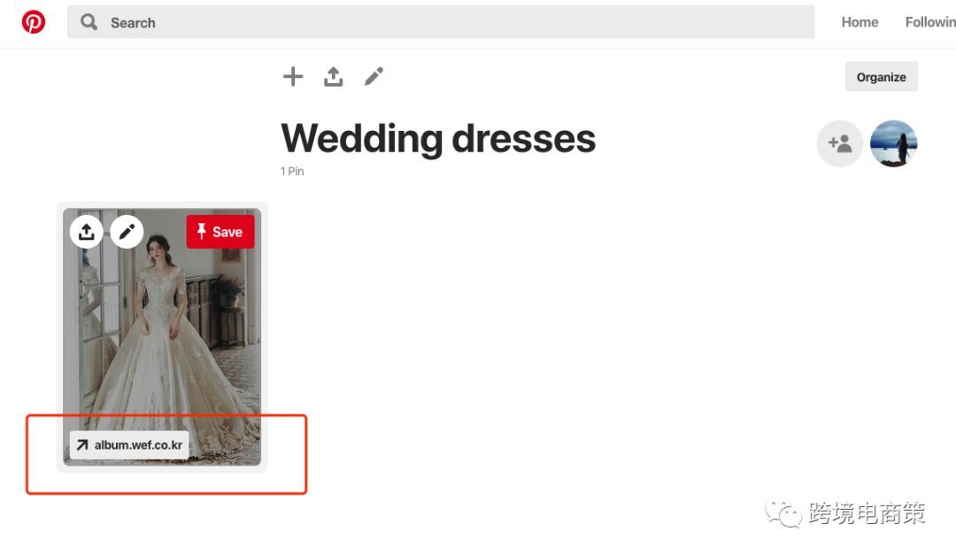 这是我新建的一个账号,你会发现现在我没有创建任何board, 你点击箭头的【+ 】这里 ,会出现create board 和create Pin 这么两种选项,我要是卖婚纱的我肯定以我的品牌名创建一个 board 类似 Tiffanys' wedding dress,或者dream wedding dress 等等,那我每次在这个上面上传图片的时候我甚至可以把这个这个产品的购买链接以及简单的介绍写在图片下方的描述里,之所以这个pinterest 有一个转发图片的功能,而且很多人彼此转发喜欢的图片,类似这样的,请看下图