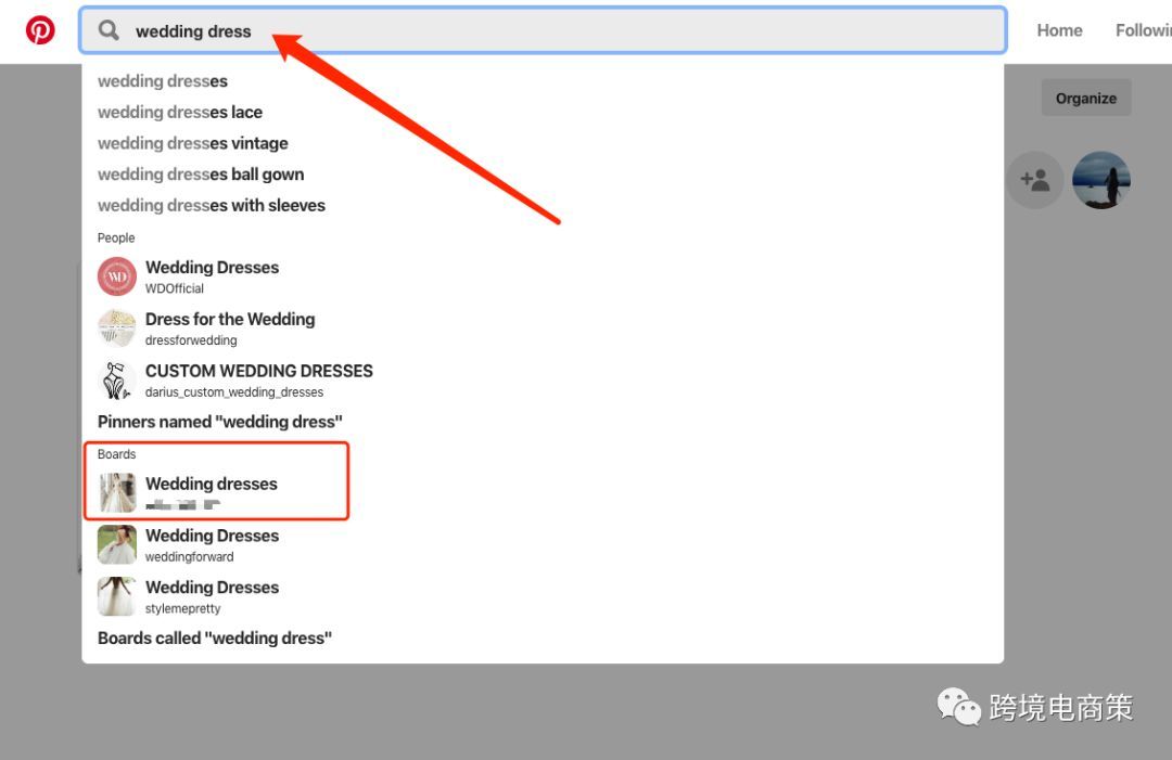 上图我转发了 (这个动作叫 re-pin)这张图 并且同时放在wedding dress 这个这个board 里面,别人在搜索框输入某一个关键词比如说就wedding dress 这个词吧,我的图片以及我的board 会出现在这个上面,所有搜索的人都能看到这个图片,并且另一个玩Pinterest的人觉得好看,如果她分享了 放在其他的board 里面(如果她想要放在 love)这个时候不仅仅在wedding dress 里面出现 还在Love 这个词搜出来的时候这张图也同时展现。