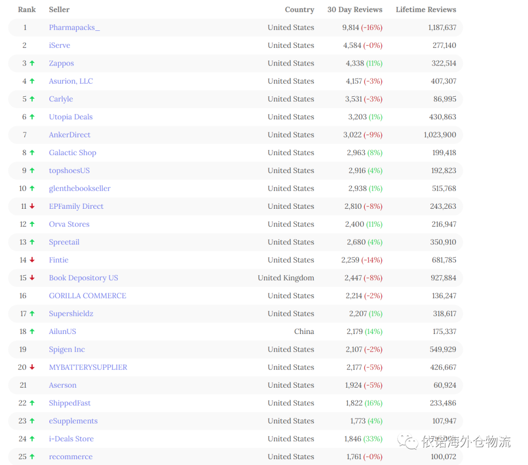 卖家排名基于过去 30 天内收到的正面评价数量。根据花哥调研,列表中大多数卖家都位于美国,100 名卖家中有 91 名。紧随其后的是中国有 6 个卖家,其次是英国有 2 个卖家,香港有1个卖家。