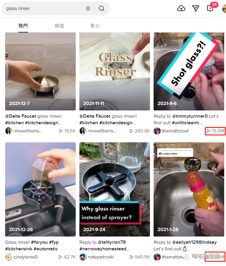 除了标签有很高的热度之外,在TikTok上用关键词"Glass Rinser"搜索,也会出现很多分享"水杯清洗器"的视频。在9-6发布的视频获得了1500万的播放,1-26发布的视频超过了2400万播放。