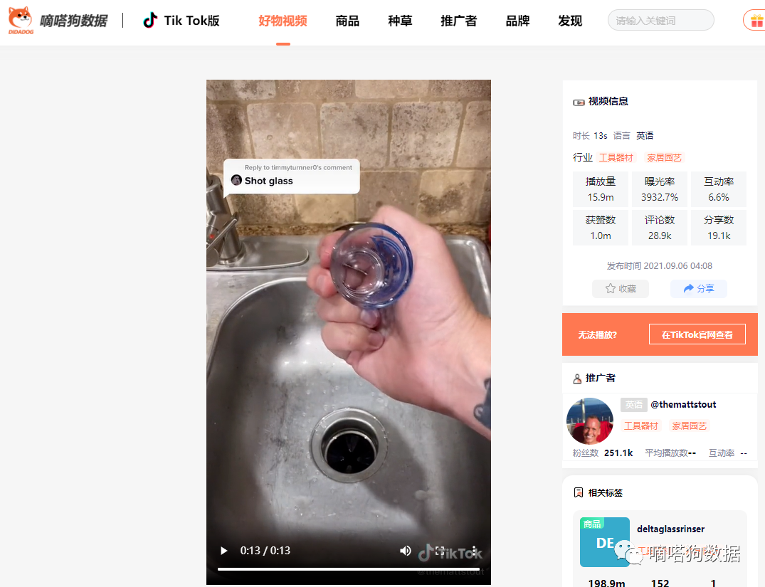 嘀嗒狗数据近期发现一款"Glass Rinser水杯清洗器"在TikTok平台十分火爆,一经发布就俘获大量用户喜爱。