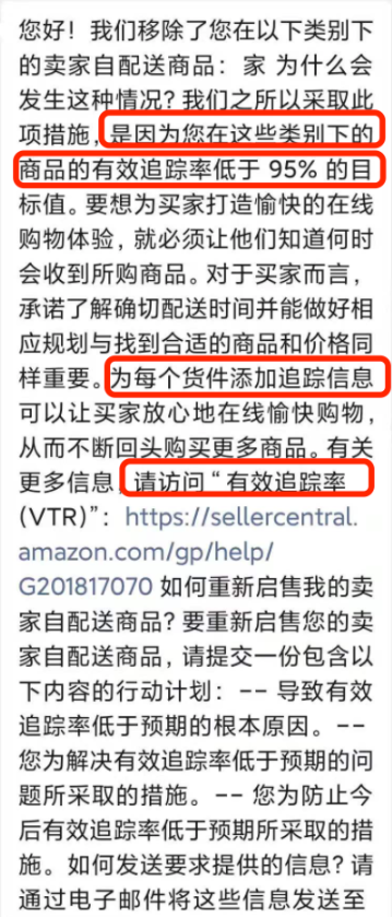 大概意思就是说亚马逊发现这位卖家在她所出售产品类别下的商品有效追踪率低于95%的目标值,亚马逊怕这样会影响消费者的购物体验,就将这位卖家的自配送渠道给关闭了,要求卖家提交一份POA才有机会恢复。