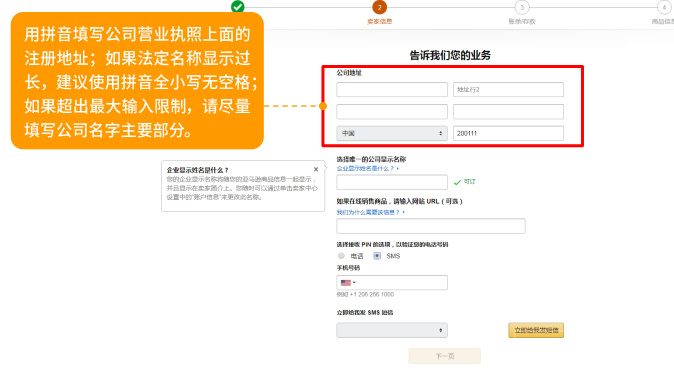 2. 公司显示名称就是亚马逊店铺的名称,建议用英文填写;