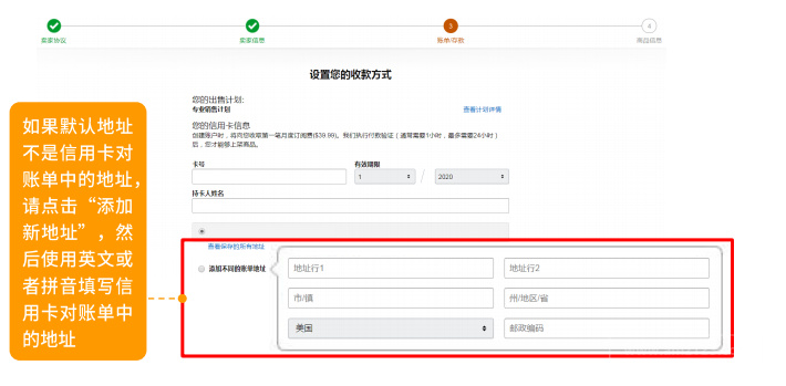 2.检查默认地址信息是否与信用卡账单地址相同。如不同,请点击"添加新地址",然后使用英文或者拼音填写新的地址信息。注意:如果填写的信用卡账单地址与您在银行填写的账单寄送地址不一致,可能会导致账户注册失败;