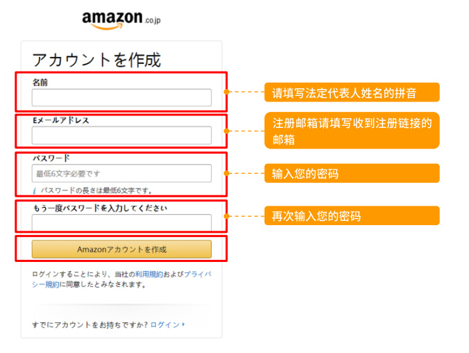 分别输入法定代表人姓名的拼音、联系用的邮箱(必须是收到注册链接的邮箱),以及密码。点击"下图中红框圈出的"按钮后,亚马逊将向这个邮箱发送包含验证码的邮件。