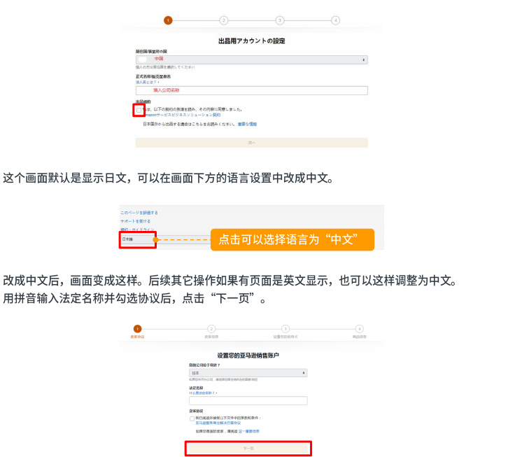 在画面中先选择公司所在的国家或地区,然后用拼音填写公司法定名称(即执照上公司名字的拼音),并勾选卖家协议。
