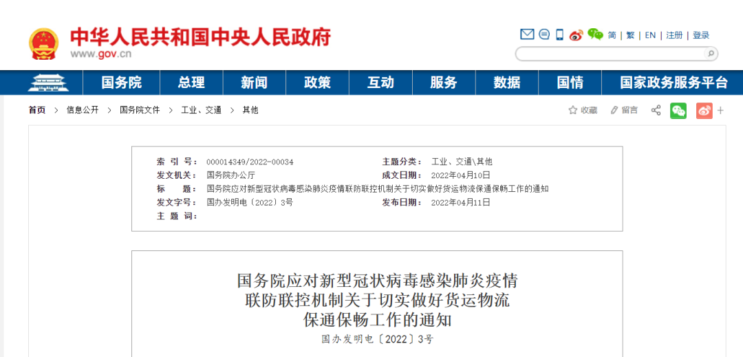 4月11日,国务院应对新型冠状病毒感染肺炎疫情联防联控机制发布关于切实做好货运物流保通保畅工作的通知。