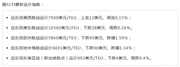 据最新获悉:德鲁里最新一期的全球航运市场报告数据显示,世界集装箱运费综合指数(WCI)下跌 0.9% 至每 40 英尺集装箱 7,657.20 美元。