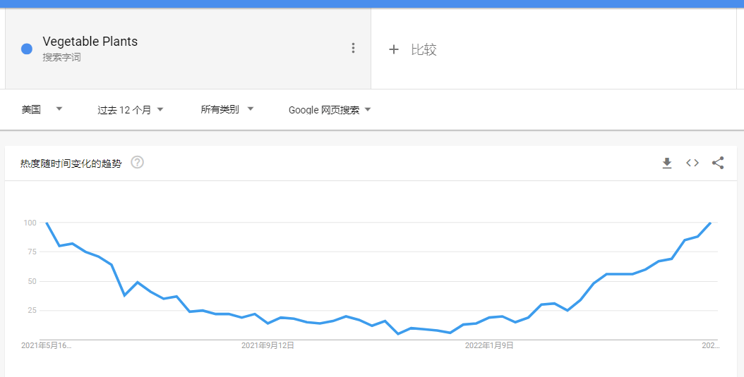 Google Trends 相关数据显示,关键词"种子"的搜索趋势在华人众多的美国地区有很明显的波动。每一年随着春夏季节的临近,种子和园艺用品的销售量会激增的趋势。